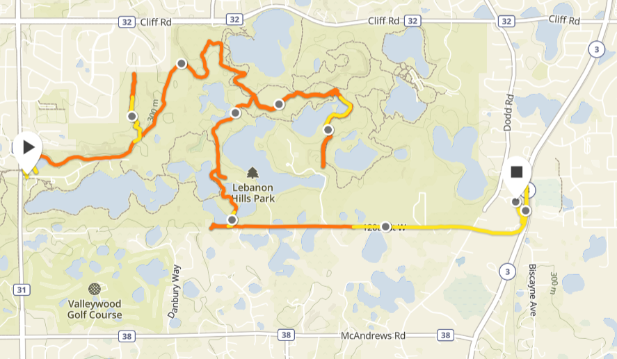 Yesterday I headed out for what I thought would be a short run at Lebanon Hills Park, a place I’ve run a dozen times before. I got started a bit late in the day, but I’d decided to do a short run since my hips have been bothering me and I would only be out there for an hour, so I knew I’d have daylight left. I didn’t take anything besides my car key since I was only going for a short run and I didn’t have any zippered pockets big enough for my phone. The parking lot was a bit full, so I decided I’d run the cross-country ski/horse trails that are normally off-limits to hikers due to either groomed trails or equine traffic, depending on the season. (I realize people still hike those trails despite the rules but I’m a stickler for following trail rules. And I hate horses.) Because I was unfamiliar with the trails, when I turned to add what I thought was just an extra half mile or so, I ended up heading in the wrong direction (you can see on the map below where I turned around and retraced my steps in the center-east section of the park), adding time and mileage to my run.