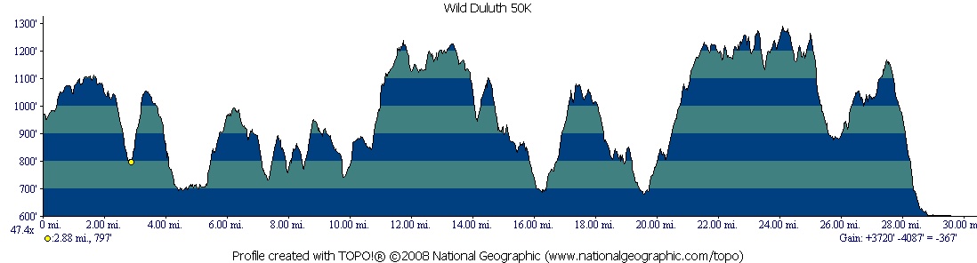This race is TECHNICAL. Here’s the course profile for the 50K, from the course website: